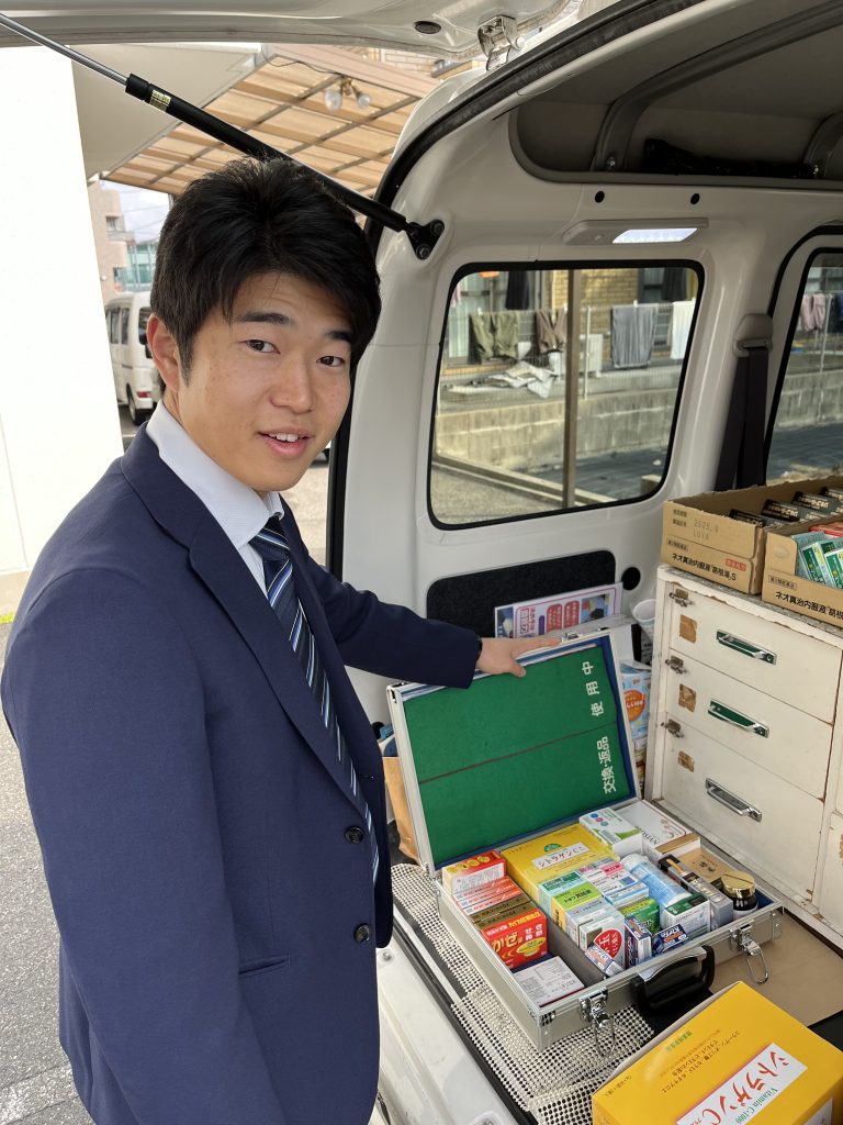 午前中は電話でお客様のアポイントを取りながらお客様宅に訪問します。お客様が薬箱を準備して待っていてくださるので、午前中はさわやかに笑顔で元気よくお伺いすることを意識しています。